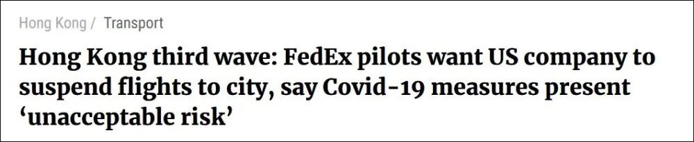 據香港《南華早報》29日報道,現在香港已經采取了更為嚴格的防疫措施,代表FedEx Express機組人員的協會聲稱香港現在所采取的新冠防疫措施會帶來“不可接受的風險”,呼吁聯邦快遞暫停所有飛往香港的航班,來抗議香港政府對機組人員強制隔離的不接受。在他們發表聲明之前,聯邦快遞的3名飛行員在香港被檢測出感染新冠病毒并接受治療。